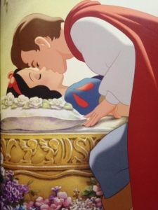 Snow White eats a poison apple given to her by the evil Queen disguised as a farmers wife, and falls into a deep sleep. Her buddies, the dwarfs, think she is dead and put her in a coffin.